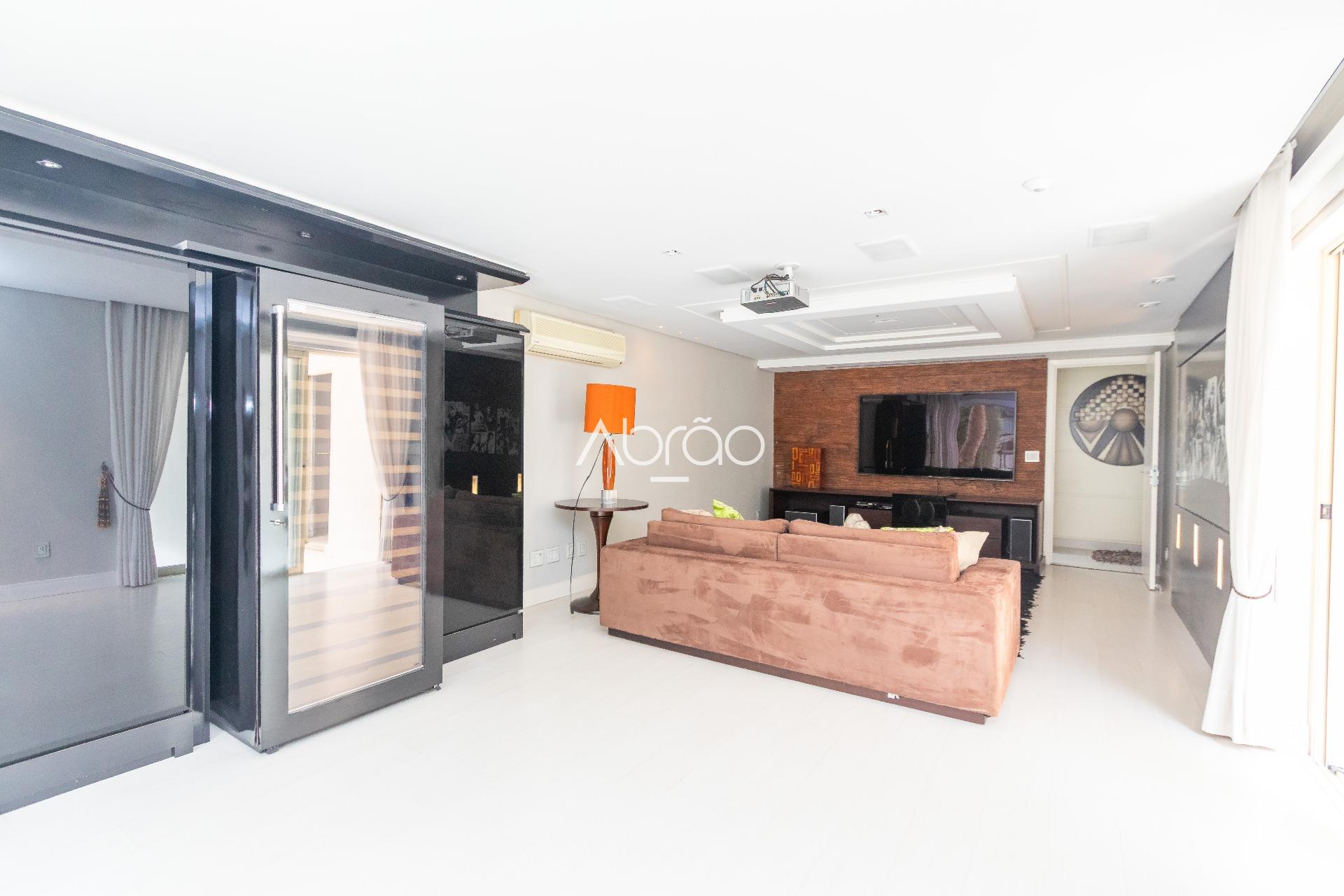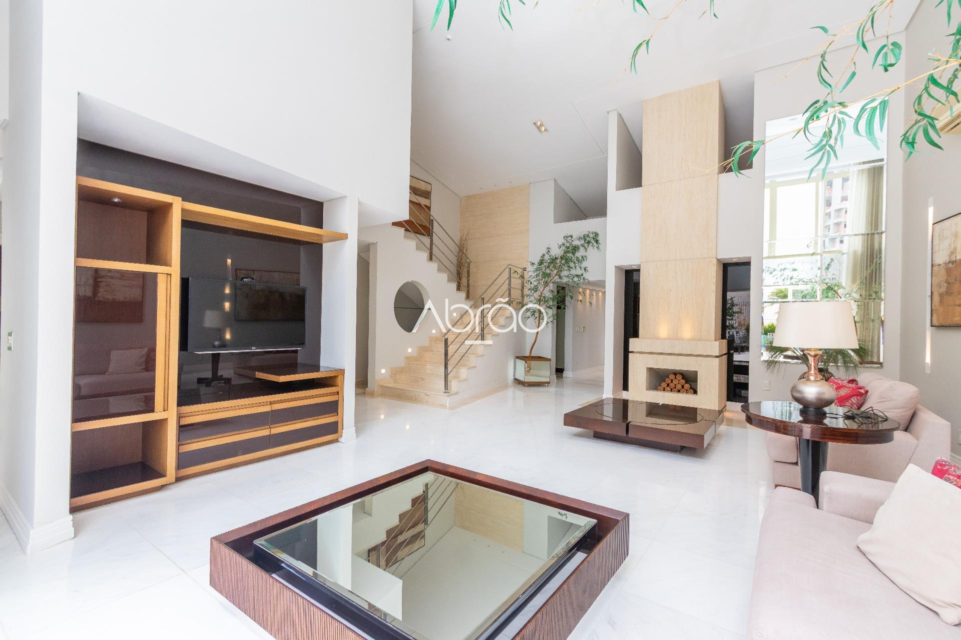 No pavimento térreo, o destaque é o amplo living com pé-direito duplo, dividido em 4 ambientes integrados, proporcionando elegância e versatilidade na decoração. O espaço conta com ar-condicionado, lareira e portas de vidro, garantindo abundante iluminação natural e integração com a área externa.